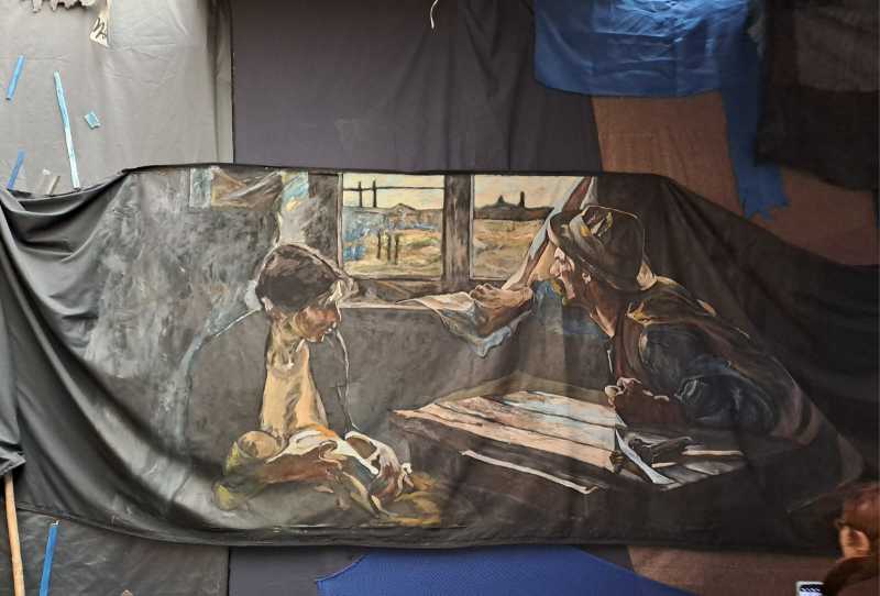 Hay un detalle no menor que impacta y refuerza aún más el mensaje: una réplica agigantada del cuadro Sin pan y sin trabajo, de Ernesto La Cárcova, realizada con maestría por los dos pintores (foto); un lienzo ubicado en la parte más grande, lo que sería el comedor de la casilla. La situación del cuadro impacta gravemente; una pareja soporta una huelga obrera, sin pan y sin trabajo. El hombre sacude su puño de bronca, las herramientas quietas sobre la mesa. La mujer amamanta a un bebé con un pecho enjuto, sin alimento ella misma, maternando sólo con las pocas reservas que le quedan, su voluntad, su amor, su deber.