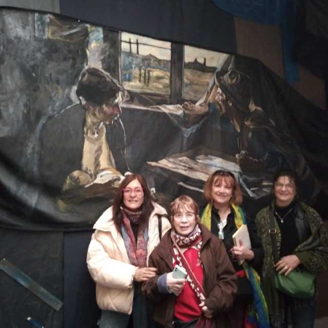 Este recurso muy muralístico, es el que el grupo Mondongo destaca y utiliza para su nueva versión de Manifestación, que re elabora y actualiza sentidos y reclamos. Si aquella de Berni, fue una manifestación por la desocupación y el hambre, ésta nueva reedita el tema apostando a la vigencia del reclamo, esta vez situada en Plaza de Mayo, con fondo de Cabildo.